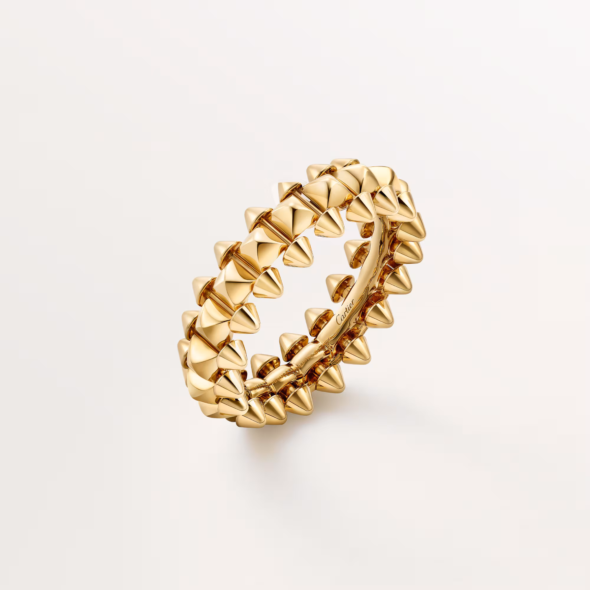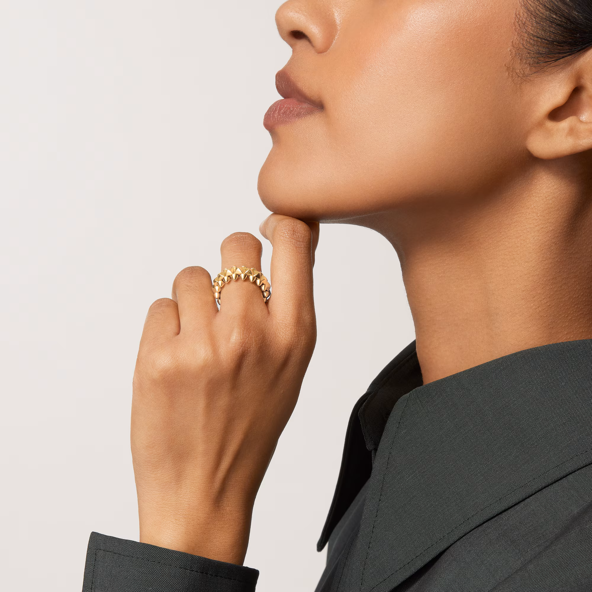 Париж, 2019. Дизайнери осучаснюють історичні шипи, подвоюючи їх і роблячи геометрію тактильною. Каблучка тримає баланс між панком і кутюром, залишаючись вишуканою.