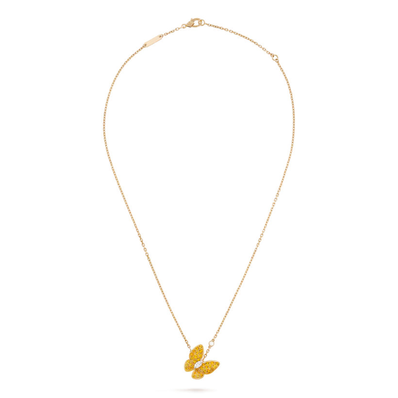 Підвіска Two Butterfly, золото 750 проби, інкрустована натуральними сапфірами круглої огранки загальною вагою 0,88 карата та діамантами огранки “маркіз” 0,2 карата. Довжина ланцюжка: 42 см.