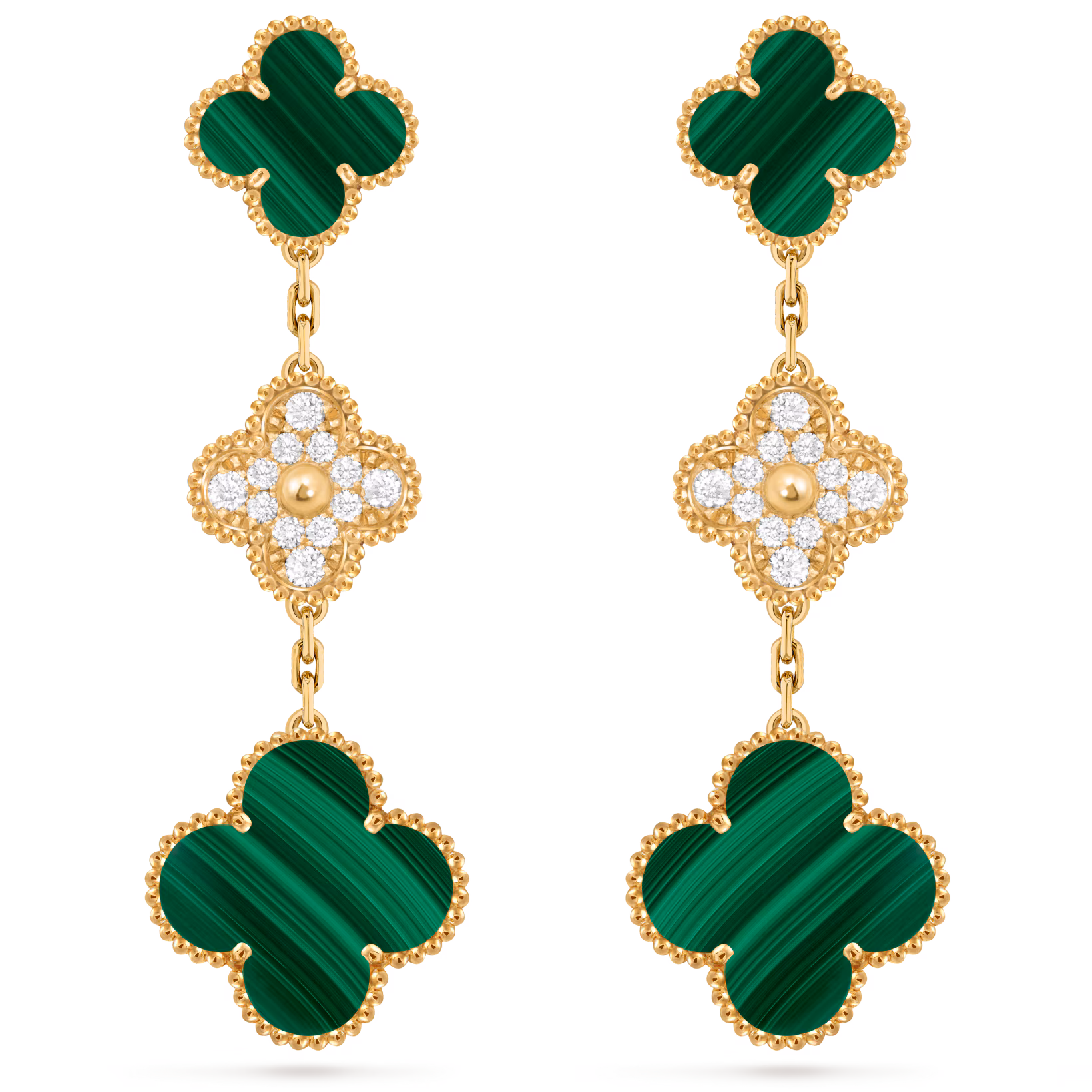 Сережки Magic Alhambra, 3 мотиви, золото 750 проби, інкрустовані діамантами круглої огранки загальною вагою 0,96 ct та малахітом.